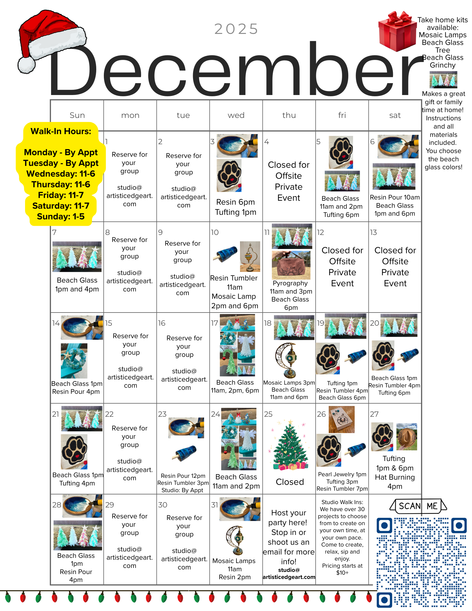 Public Workshops Click on the calendar to book your spot! Greenville Studio Workshops Pick Your Project Reservations Tufting Images (or email in your own)